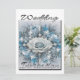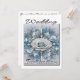 Convite para casamento com um buquê de flores em azul e branco cintilante - A rosa branca está no centro da carta. Você pode mudar a parte de trás do cartão para as informações do seu casamento relevantes para a cerimônia ou esquema de cores ou direções para o local. O escrevendo está em prata para ir com as cores do cartão.