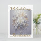 Convite para casamento com um buquê de flores em blues e dourados mudados - As flores são 3D no cartão. Você pode mudar a parte de trás do cartão para as informações do seu casamento relevantes para a cerimônia ou esquema de cores ou direções para o local. O escrevendo está Dourado para ir com as cores do cartão.
