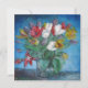 Sala azul com buquê de flores de tulipas coloridas num cartão de convite quadrado vaso. Tulipas púrpura, vermelha/ rosa, brancas e amarelas - quadros impressionistas de pintura de cartaz de arte fina - quadrado convidam impressão. Um belo cartão de presente floral de tulipa.