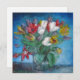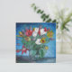 Sala azul com buquê de flores de tulipas coloridas num cartão de convite quadrado vaso. Tulipas púrpura, vermelha/ rosa, brancas e amarelas - quadros impressionistas de pintura de cartaz de arte fina - quadrado convidam impressão. Um belo cartão de presente floral de tulipa.