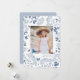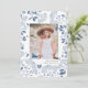 Elegante cartão com fotos Chanucá apresenta uma foto favorita orientada para retratos ou verticais cercada por uma borda de delicada folhagem botânica azul e minúsculas flores de aquarela. Seu cartões de natal personalizado e seu nome ou nomes de família aparecem abaixo da sua foto em carateres de cinza. Personalize as costas com duas fotos adicionais e uma mensagem pessoal.