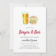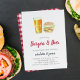 Os convites de festa de noivado "hambúrgueres & cerveja" casuais apresentam ilustrações de aquarela e letra de script de pincel. Perfeito para as festas de noivado de verão ou ao ar livre, esses convites casuais de chic são facilmente personalizados com seus detalhes de celebração. Convites invertendo um padrão de gingham vermelho e branco.