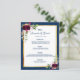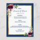 Um cartão de cardápio do estilo boêmico elegante. Penas e rosas de cor aquosa em burgundy. Modelos para seus nomes, data e menu de casamento. Um quadro de ouro falso e um fundo azul e branco de marinho chic. Letras marinhos de cor azul. Fundo: fundo azul marinho.
