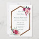 Um convite divertido e na moda boho com uma estrutura geométrica dourada contra um fundo transparente. O quadro é acentuado por rosas de burlões, peônias cor-de-rosa e penas. Seus nomes e detalhes aparecem em uma fonte segura e sofisticada. A parte traseira apresenta seus nomes em um plano de cores de cheio.