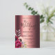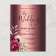 Na frente: Um convite de casamento moderno e elegante. Um fundo metálico de cobre falsa. Decorado com flores roxas escuras e borboletas e cor-de-rosa. Modelos para nomes, data e local do casamento. O texto: O Casamento é escrito com uma escrita de estilo, escrita em letras grandes, escrita em letras negras. Fundo: fundo metálico de cobre falsa.