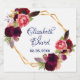 Um rótulo de garrafa de vinho espumante e elegante para uma boêmia, estilo boho, casamento ou casamento. Decorado com uma falsa estrutura geométrica dourada. Com rosas de cor d'água em burgundy e rosa. Fundo branco elegante. Modelos para nomes e uma data. Os nomes são escritos com um moderno estilo escrito à mão. Letras marinhos de cor azul.