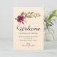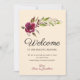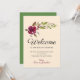 Adicione este cartão especial de boas-vindas para receber presentes para seus convidados fora da cidade. Este cartão de boas-vindas do casamento oferece lindas flores de burgundy e verde num fundo creme colorido. O gráfico de aquarela na moda aparece na parte superior do convite vertical. O texto personalizado permite adicionar uma mensagem pessoal de boas-vindas à sua família e amigos.