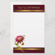 Papel de carta festivo, em branco, com gráficos de ouro esboçados como burgundy poinsettia bloom, no canto inferior esquerdo. Um cabeçalho e rodapé de ouro e burro decoram esta papelaria cônica e um texto gráfico de tom dourado lê Feliz Natal, no topo. Personalize para adicionar texto ou usar em sua própria impressora em casa. Um belo papel para a sua carta de Natal anual.