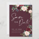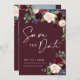 Boho Burgundy e Blush floral Salve a data Convite. Esse convite se caracteriza por boho burgundy e rosas e flores esmagados com duas fontes modernas de alta classe que moldam as tendências dos eventos festivos atuais e futuros.