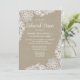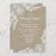 Janto de ensaios de burlap & Lace Floral Invtions — apresenta um fundo de burlap impresso com um padrão decorativo de rendas florais ao redor do topo e do fundo para convidar um país ou tema rústico ou vintage.