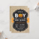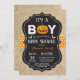 Cartão de Convite para Chá de Bebê Halloween com burlap, laranja e fundo de quadro. Para mais personalização, clique no botão "Personalizar" e use nossa ferramenta de design para modificar este modelo.