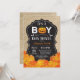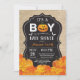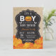 Cartão de Convite para Chá de Bebê Halloween com burlap, laranja e fundo de quadro. Para mais personalização, clique no botão "Personalizar" e use nossa ferramenta de design para modificar este modelo.