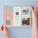 Modelo de folheto comercial em azul suave e cor de pêssego com fotos de produtos, modelo de logotipo e lugar para seu código QR. O modelo de viagem tem título de negócios, texto menor e modelo de logotipo na frente. Adicione uma grande foto do seu compro, ou localize para cobrir a parte traseira do papel, onde uma seção "sobre" e uma foto são colocadas. Este exemplo de folheto é feito para ser dobrado - último painel para dentro, depois 3 e centro para trás, atrás da página frontal. O folheto dobrado em z é alto e fino e se abre para fora para mostrar tudo neste primeiro lado do papel. Quando eles olharem atrás eles verão sua foto e sua seção.