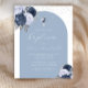 Este elegante convite para batismo apresenta uma forma empoeirada de arco azul sobre um fundo branco, flanqueado em dois cantos por um par de buquês florais azuis e azuis marinhos com folhagem prateada. Um terceiro buquê, menor, aparece numa cruz de folha de alumínio de prata, acima das palavras "por favor junte-se a nós para o batismo do nosso filho" em elegante caligrafia branca e itálico. Personalize-o com o nome no script branco e os detalhes na fonte sans serif. Uma aspersão de folha de papel fina prateada confunde o bordo superior da placa. O verso é azul sólido empoeirado.