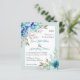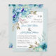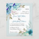 Flores de aquarela azul BUDGET convite para casamento verde da horta floral com código QR para RSVP. Ele mostra buquês de flores em tons verdes azuis e mint nos cantos enquanto seu texto é colocado em um quadro branco com uma borda. O verso inclui as terras florais nas partes superior e inferior e o código QR para os convidados digitalizarem e responderem.