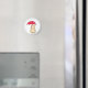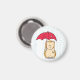 Magneta com desenho de um ouriço fofo com um guarda-chuva vermelho rasgado, em pé na chuva.