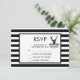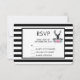 Cartão RSVP de Casamento ou outro evento com uma cabeça de cervo preto com chifres grandes. Linhas geométricas dentro na face do veado acrescentam um toque criativo. Flores cor-de-rosa e folhas verdes de menta formam um bonito buquê floral abaixo de sua cabeça. Um esboço de serra colocado entre as flores também agrava o sentimento rústico do país. O fundo é um padrão listrado preto e branco.