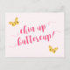 NewParkLane - Cartão postal, apresentando lindas borboletas amarelas e citação doce: "Chin up buttercup!" em tipografia elegante rosa quente, contra um fundo rosa suave.