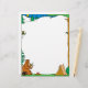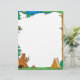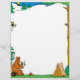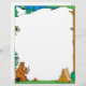 Este cabeçalho de carta de férias apresenta uma cena de acampamento com uma barraca e um grande urso sentado em um tronco enquanto bebe uma bebida e assa marshmallows em uma fogueira.