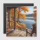 Este cartão de aniversário apresenta uma cena sonhadora de uma cabana perto do lago no outono.
