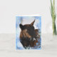 Um cartão de Natal e Ano Novo para amantes de os animais com uma foto de uma cabra alpina parada na neve com nariz nevado depois de cavar para maçãs caídas.