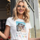 Camiseta personalizada com fotografia de seu querido cão, o ditado "melhor mãe de cachorro do mundo" e o nome dos animais de estimação. Dica da foto: recorte as fotos em quadrados antes de carregar, garantindo que o assunto esteja no centro para obter melhores resultados.
