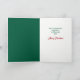 Na frente deste cartão de Natal, um cão Brittany castanho e branco senta-se ao lado de uma árvore de Natal bem decorada. O cachorro está olhando para um pássaro Bullfinch vermelho que está prestes a pousar na árvore. Uma cesta de presentes mais vadia fica em frente à árvore. O texto vermelho e verde diz "JOY Natal". Dentro são dois campos de texto que você pode personalizar ou deixar como está.