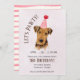 Uma ilustração fofa de cachorro para um convite de aniversário do aniversário do seu filho ou até do aniversário do seu cachorro! O cachorro marrom está vestindo um chapéu de festa rosa. Personalize os detalhes do seu próprio evento.
