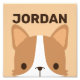 Uma design para animar o seu dia. Este design apresenta uma ilustração fofa de desenho animado de cão-corgi com nome personalizado no estilo de fonte serif sans moderno marrom sobre fundo castanho-claro. Uma decoração personalizada para bebês e meninas.