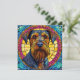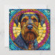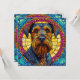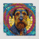 Retrato de um cão com uma barba espessa, espessa e olhos expressivos, enquadrado por um fundo vívido, colorido, em tons amarelos, rosa e azuis.