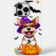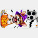 Cachorro ao estilo cartoon com uma expressão feliz, vestindo um chapéu de bruxa roxa. O cachorro está sentado em frente a uma abóbora esculpida que tem um rosto alegre e sorridente. Ao redor do cão há pedaços coloridos de milho doce espalhados pelo chão, e vários morcegos voando ao fundo somam ao tema do Halloween