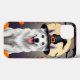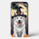 Cachorro branco alegre vestindo um chapéu preto de bruxa com uma fivela amarela. O fundo inclui uma grande lua cheia, lançando uma luz suave, e é rodeado por elementos assustadores como morcegos voando. Na parte inferior, há abóboras laranja vibrantes com rostos esculpidos, adicionando ao tema de Halloween. A atmosfera geral é lúdica e festiva, celebrando o espírito de Halloween com o cachorro como figura central.