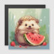 ilustração encantadora de um ouriço desfrutando um pedaço de melancia. O ouriço tem uma expressão feliz, com os olhos fechados em deleite, e está cercado por alguns morangos e folhas. O estilo de desenho de tinta adiciona um toque brilhante e fofo à cena.