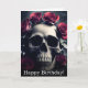 Uma pintura escura e gótica de um crânio humano rodeado por rosas e pétalas góticas pidas, apresentando uma atmosfera gótica dessaturada e de outro mundo, este cartão de aniversário é perfeito para amantes de crânios góticos escuros e flores e rosas góticos românticos escuros, dando uma mensagem de aniversário única com este único crânio gótico e Rosa de aniversário completo com texto e imagens editáveis, personalize para suas necessidades.