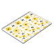 Um caderno espiral que caracteriza um teste padrão com ilustrações de abelhas, de flores, e de bolinhas do mel.