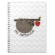 Um caderno espiral que caracteriza uma ilustração de uma preguiça que pendura de um ramo de árvore da maçã com uma maçã vermelha. Personalize o nome. O fundo é viga cinzenta. Artigos de harmonização Look for na escola cor-de-rosa.