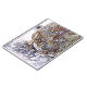 Um design fotográfico da maré marinha se lavando na praia e rochas, expondo as algas e os lagoas.