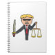 Um advogado segura a espada ou a verdade e as escalas da justiça. Veste tons em vez de uma venda e um sorriso de dentes grande.