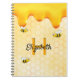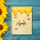 Fundo amarelo e branco com um padrão de favo de mel. Decorado com mel dourado doce escorrendo e abelhas felizes. Modelos para o seu nome e letra de monograma. Perfeito para manter suas notas trabalhando de casa, suas receitas de verão ou notas do jardim e quintal.
