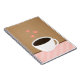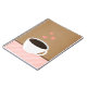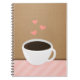 Uma caneca de café, cheio do café, está em um fundo marrom levemente textured, com a metade inferior em listras cor-de-rosa. Três corações cor-de-rosa flutuam acima do café.