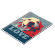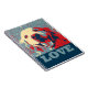 Este caderno caracteriza um close up de um cão de sorriso do golden retriever, feito no estilo do estêncil da "esperança" com cores vermelhas, brancas e azuis, junto com o amor da palavra.