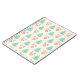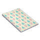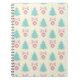 Um caderno com um padrão de natal festivo sobre fundo creme. Ilustrações de árvores de natal de cor pastel, azul-esverdeado, e bolhas e arcos cor-de-rosa pastel em padrão repetitivo.