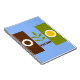 Notebook com bandeira de Fresno, Califórnia; bandeira com três bandas verticais de castanho, azul e verde, com ilustrações estilizadas de berço, planta e sol