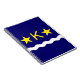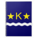Notebook com design com bandeira de Kinshasa, capital da República Democrática do Congo, bandeira azul com onda branca, duas estrelas ouros e letra "K" no centro