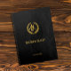 Livro de marcação do compro Barber com logotipo de tesoura dourada falsa e roteiro de barbeiro em um olhar elegante preto sólido