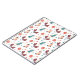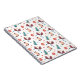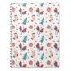 Bloco de anotações temático do Natal bonito com um padrão repetido de árvores de Natal verdes, mitenes frias e quentes, meias bonitas e borbulhas vermelhas sobre fundo branco.