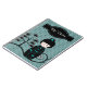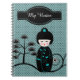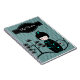 Os presentes e os acessórios personalizados com uma boneca japonesa bonito no quimono vestem-se contra um fundo azul e preto das bolinhas e um teste padrão oriental ornamentado da árvore e da planta.