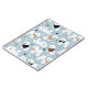 Cão-de-bichão-gato frita em suéteres e arcos com ossos de cão espalhados e estampas de pata sobre fundo azul-claro.