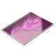 The image features a stylized pink floral design against a gradient background of pink and purple hues.