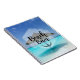 Um caderno espiral com uma imagem tropical de um mar turquesa com uma praia branca arenosa e um solteiro que chocava um guarda-chuva de praia. A tipografia diz Beach Bum.